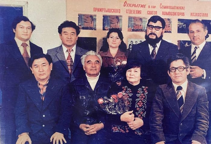 2 ряд: М. Рахимбаев, Т. Базарбаев, А. Искакова, О.Джанияров, Х. Тегерменджиди, 1979 г.